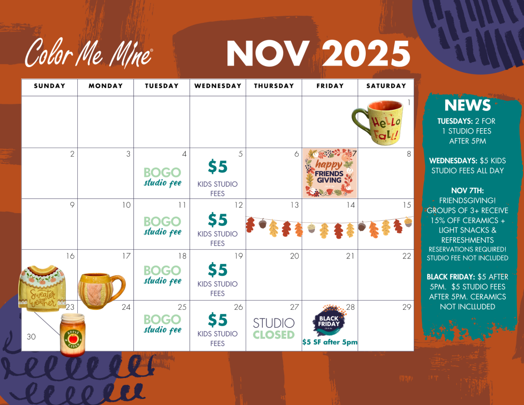 11/7: Friendsgiving Event: 15% off ceramics after 5pm! Snacks and refreshments will be served. Reservations required to enjoy discount/snacks. Studio fees not included.