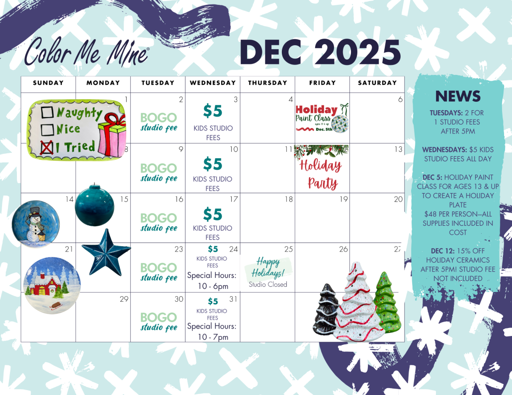 12/5: Holiday Paint Class 6-8pm. For ages 13+. Learn how to paint an adorable holiday plate for $48 (plus tax - price includes all supplies) and have it ready just in time for the holidays!